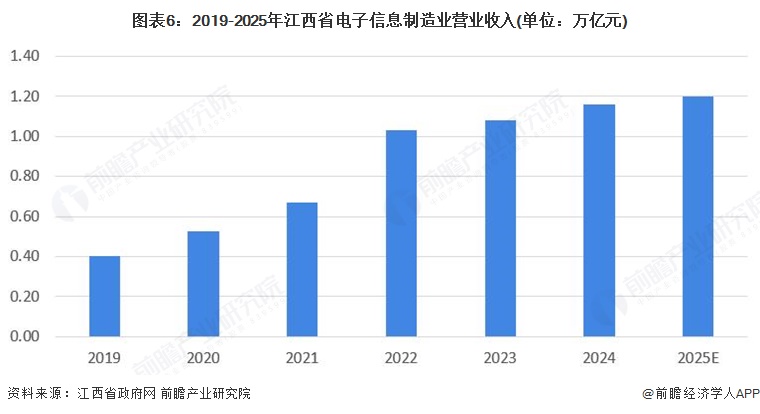 电子信息是江西首个“万亿级产业”,2022年首次跨过万亿元,2024年全省电子信息制造业营业收入达1.16万亿元,占全省规模以上工业总产值20.9%,位居全国前列;预计2025年江西省电子信息产业规模将突破1.2万亿元。
