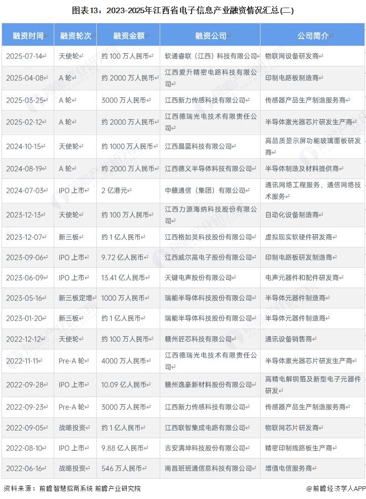 从电子信息产业融资情况来看,2023-2025年,江西省电子信息产业融资十分活跃。从融资轮次分布情况来看,主要为A轮及之前轮次融资以及IPO、战略融资轮次,整体来看江西省电子信息产业具有良好的融资环境。