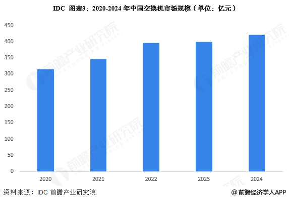 中国交换机市场近年来发展势头良好,市场规模逐年递增,根据IDC披露的数据显示,2024年中国交换机市场规模约为422亿元,同比上涨5.5%左右。