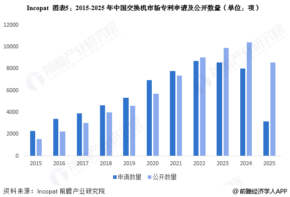 根据Incopat披露的数据显示,2015-2024年中国交换机市场专利申请数量和公开数量总体上升,2024年数量分别为8036项及10403项。