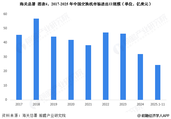 中国交换机进出口规模近年来有所下滑,根据海关总署披露的数据显示,2024年中国交换机市场进出口规模为31.95亿美元,同比下滑31.05%;2025年1-11月,中国交换机市场进出口规模为24.33亿美元。