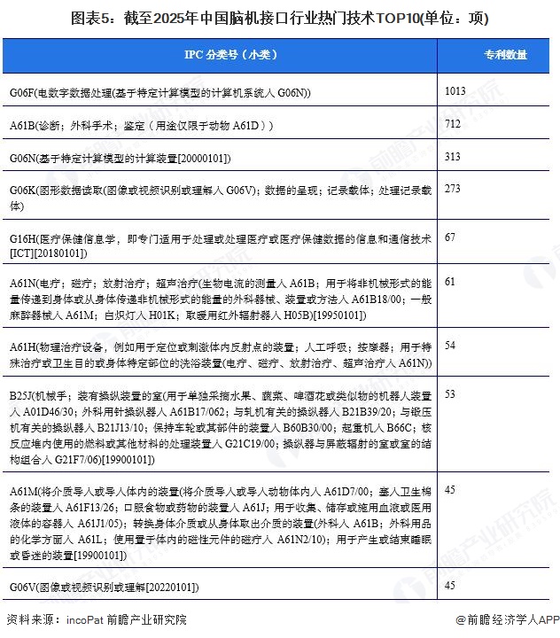 从热门技术来看,我国脑机接口行业热门技术专利数量最多的是G06F(电数字数据处理(基于特定计算模型的计算机系统入G06N)),共有1013项专利,其次是A61B(诊断;外科;鉴定(分析生物材料入G01N,如G01N33/48))和G06N(基于特定计算模型的计算装置[20000101]),分别有712项和313项。
