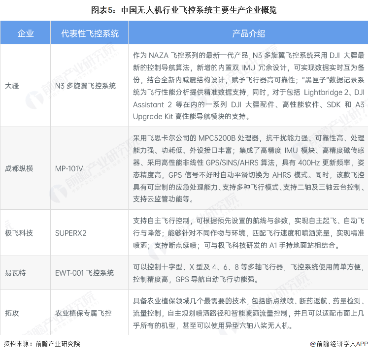 国内主要的飞控设计生产厂商有:大疆、成都纵横、极飞科技、易瓦特、拓攻等。