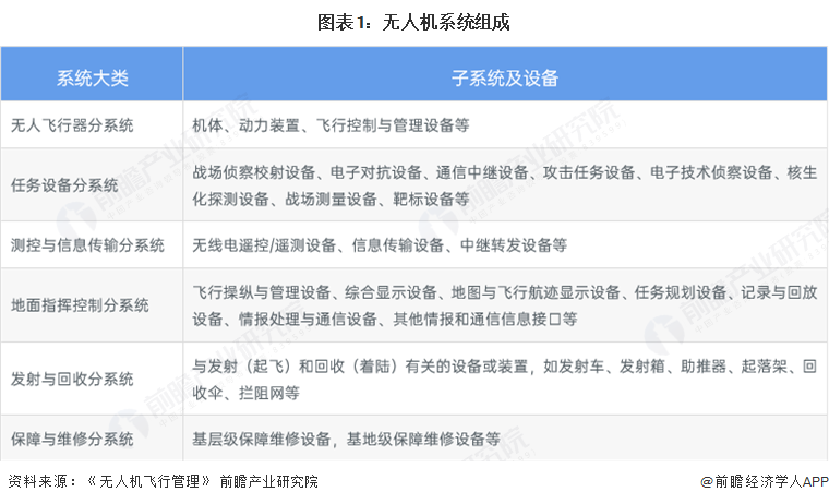 根据陈金良、高文明、史继刚等人编写的《无人机飞行管理》,无人机系统主要包括六大系统,分别为无人飞行器分系统、任务设备分系统、测控与信息传输分系统、指挥控制分系统、发射与回收分系统、保障与维修分系统。其中,飞控系统是无人机最重要的系统之一。