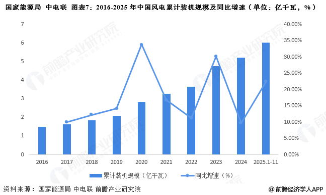 风电EPC市场的需求主要来源于风电场的建设,以风电装机规模来看,2016-2024年,中国风电行业累计装机规模持续上升,其中2020年风电累计装机规模增速达到了33.81%,为近年来最高值。截至2025年11月,我国风电累计装机规模达到6.03亿千瓦,同比增长22.4%,风电累计装机规模的不断增长带动了新的风电场开发,从而拉动风电EPC的需求持续攀升。