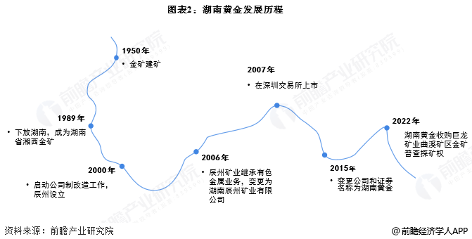 湖南黄金前身为湖南省湘西金矿,2000年改制成为公司制企业,2006年有色金属业务剥离,由辰州矿业继承并于2007年完成上市,2015年公司更名为湖南黄金并于2022年开始收购金矿,扩大自己的资源储量。目前企业已经成为国内黄金行业前十大企业之一以及锑行业龙头企业。