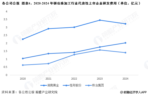 随着锑行业的不断发展,锑冶炼、加工技术不断更新换代。湖南黄金研发投入高,2024年研发费用为3.24亿元,位于锑冶炼、加工行业上市企业第一。排名第二的位恒邦集团,研发费用为2.03亿元。