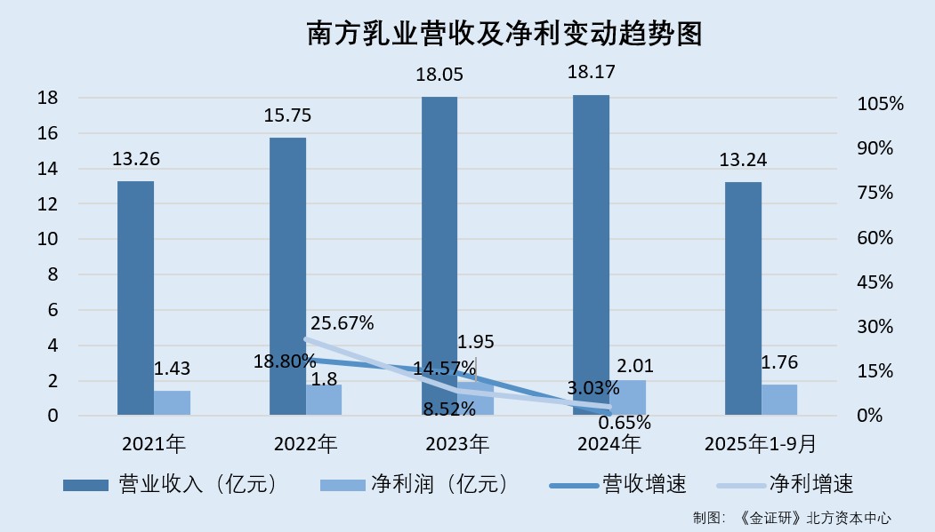 据南方乳业2025年度审阅报告,2025年,南方乳业的营业收入为18.38亿元,较上年同期增长1.2%,净利润为2.2亿元,较上年同期增长9.53%。