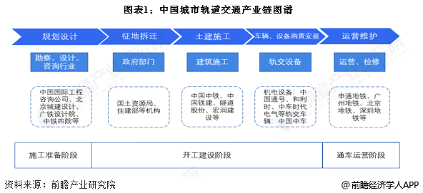 随着城市轨道交通的发展建设,轨道交通相关产业也随之强大起来,在带动一个城市GDP增长的基础上,轨道交通也开拓性的促进了相关产业链的形成。从城市轨道交通项目的建设流程来看,其主要分为施工准备、开工建设和通车运营三个大的阶段,这也是城市轨道交通的上中下游三个阶段。