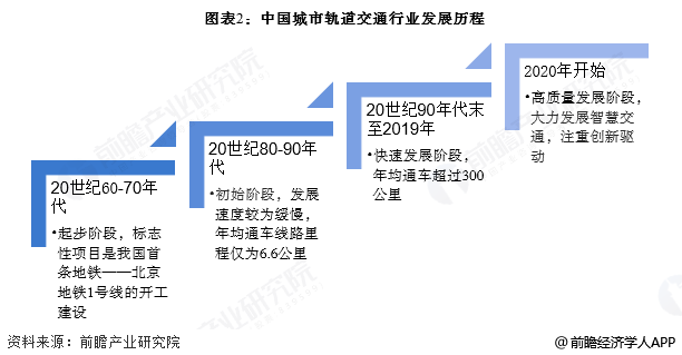 高质量发展阶段(2020年开始):2019年9月,国家发布《交通强国建设纲要》,提出要大力发展智慧交通。推动大数据、互联网、人工智能、区块链、超级计算等新技术与交通行业深度融合。推进数据资源赋能交通发展,加速交通基础设施网、运输服务网、能源网与信息网络融合发展,构建泛在先进的交通信息基础设施。由此,中国城市轨道交通发展进入新阶段,由追求速度规模向更加注重质量效益转变,由传统要素驱动向更加注重创新驱动转变。