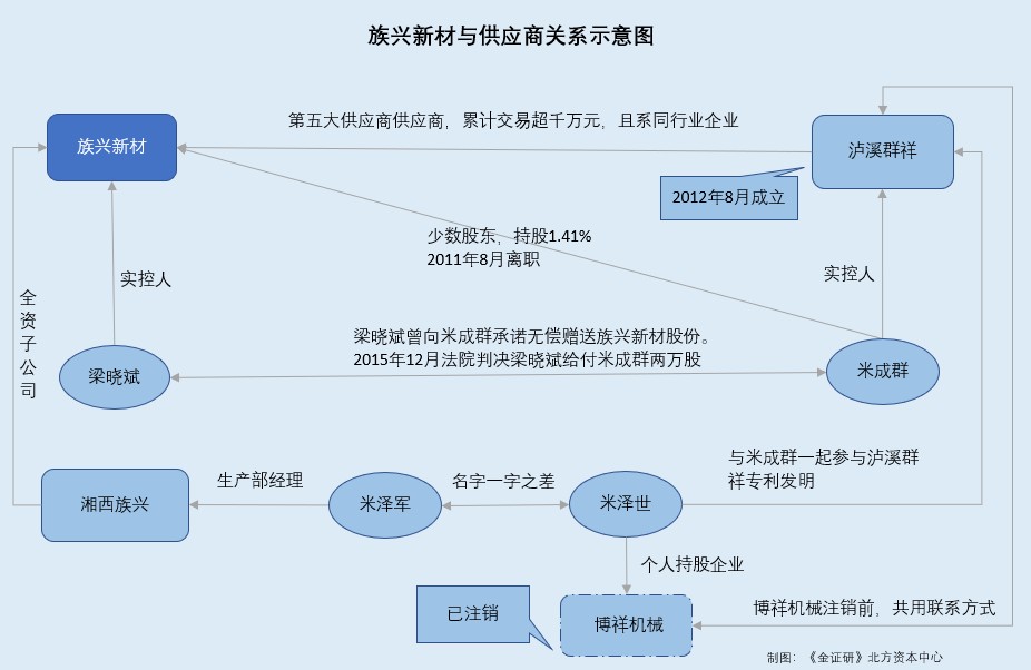 简言之,近三年又一期,族兴新材对泸溪群祥的采购额合计超1,800万元,且族兴新材表示因需求扩大且与泸溪群祥距离近,而向泸溪群祥采购金额增加。需要指出的是,泸溪群祥实控人米成群系族兴新材持股1.41%的股东。族兴新材称除此之外,其与泸溪群祥无关联关系。研究发现,米成群自族兴新材辞职次年成立泸溪群祥。另外,族兴新材子公司湘西族兴生产经理米泽军,与泸溪群祥专利发明人米泽世的姓名仅“一字之差”。不仅如此,湘西族兴与泸溪群祥同处一园区。