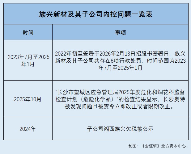 据签署于2026年2月13日招股书,2022年初至签署日,族兴新材及其子公司共存在6项行政处罚,时间范围为2023年7月至2025年1月。其中,2023年7月,族兴新材因未根据职业健康检查报告对需要复查的劳动安排复查,被宁乡市卫生健康局作出警告、并罚款7,000元的行政处罚。