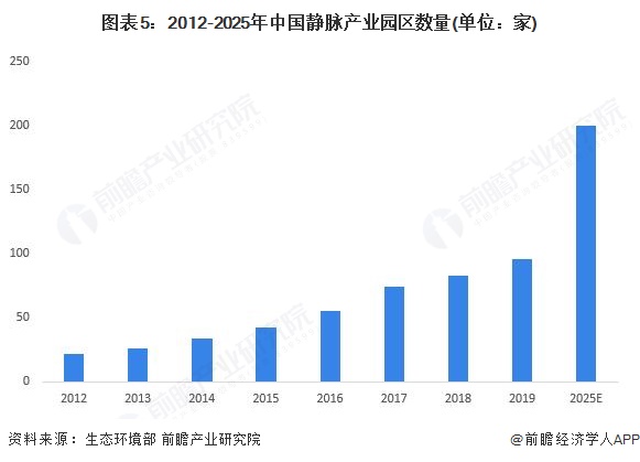 从中国静脉产业园区数量来看,2012-2019年呈现迅速增长的趋势,静脉产业园区数量由2012年22家增长至2019年的96家。前瞻初步估算,至2025年年底我国静脉产业园区数量约为200家。