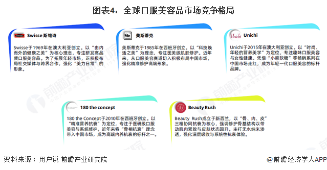全球口服美容品市场呈现出多品牌差异化竞争的格局,来自澳大利亚、西班牙、新西兰等不同地区的品牌各有特色。Swisse以“由内而外的健康之美”为核心,通过社交媒体与跨界合作强化年轻化品牌形象;美斯蒂克与180 the Concept来自西班牙,前者以科技焕活美肌切入中国市场并塑造高端修护形象,后者主打精准营养抗衰,凭借“骨相抗衰”理念成为高端抗衰标杆;澳大利亚品牌Unichi聚焦年轻客群,以趣味口服美容产品走红中国市场;新西兰品牌Beauty Rush则以“骨、肉、皮”三相协同抗衰为核心,强调深层吸收与系统性抗衰体验,各品牌依托自身定位与特色在全球及中国市场展开竞争。