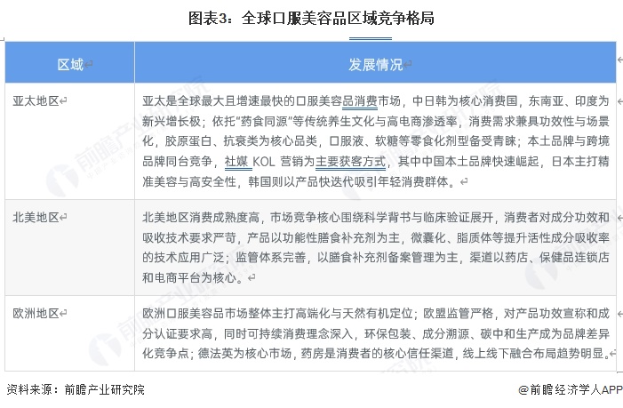 全球口服美容品市场形成各区域差异化发展的竞争格局,亚太地区作为全球最大且增速最快的核心消费市场,以中日韩为核心、东南亚和印度为新兴增长极,依托传统养生文化与高电商渗透率形成功效性与场景化的消费需求;北美地区消费成熟度高,市场竞争以科学背书和临床验证为核心,注重活性成分吸收技术应用,监管体系完善且销售渠道多元;欧洲地区则主打高端化与天然有机定位,欧盟严苛监管下,可持续发展成为品牌差异化竞争关键,德法英为核心市场,药房是核心信任渠道,线上线下融合布局趋势显著。