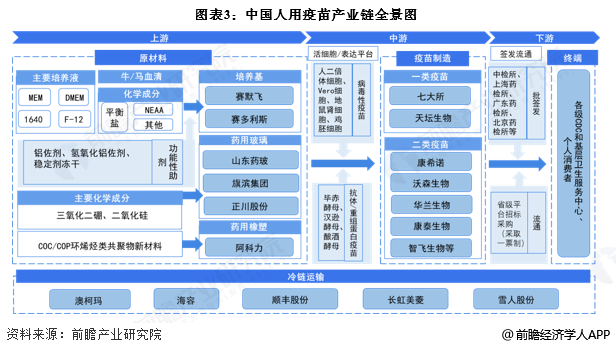 疫苗行业的上游一般包括参与生产培养基、化学试剂和药包材等制造企业,疫苗行业的下游是批签发和流通,其终端是实施疾病预防和控制工作的各级疾控中心、医院、接种点,最终端为普通消费者。同时,为保证疫苗和培养基等相关产品在运输途中不失活,专业的医药冷链运输需要贯穿始终。