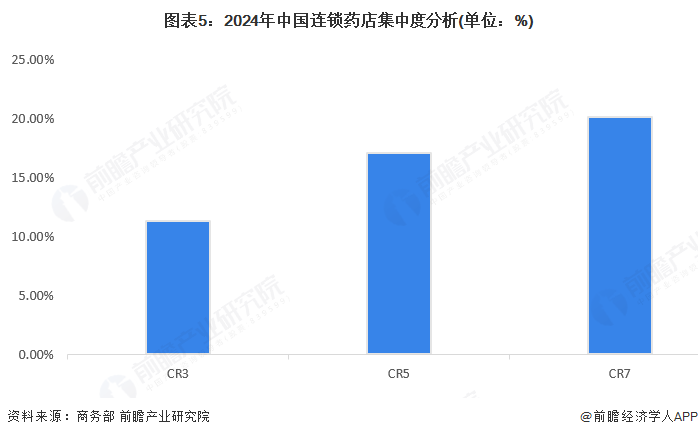 2024年,中国连锁药店行业集中度CR3为11.32%,CR5达到17.06 %,CR7超过20%,行业集中度处于较低水平,未来仍有较大的提升空间。