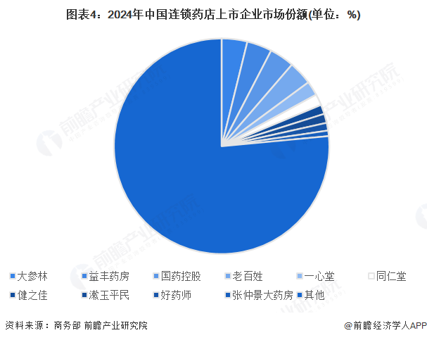2024年,中国连锁药店行业市场份额领先的企业包括大参林、益丰药房、国药控股、老百姓等,市场份额均超过3%,一心堂市场份额超2%。