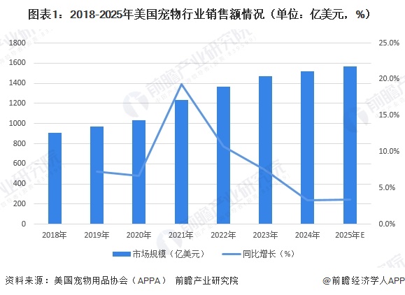 在美国,养宠文化十分盛行,宠物家庭渗透率极高,宠物被人们视作家庭中的一份子,人们非常重视宠物的生活品质,因此形成了美国庞大且种类丰富的宠物消费市场。作为全球宠物饲养数量最多、消费能力最强的国家,美国宠物行业展现出庞大的市场规模和成熟的产业结构。根据美国宠物用品协会(APPA)的数据,2024年美国宠物行业的销售额达到1519亿美元,同比增长3.3%;初步统计2025年美国宠物行业销售额将继续保持增长态势,达到1570亿美元,预计增长3.4%,美国宠物行业正进入一个稳步增长的新阶段。