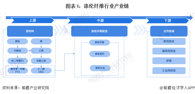 从产业链角度出发,涤纶纤维业可分为上游的PTA、MEG、原油等原材料供应商;中游的涤纶纤维制造企业,包括涤纶短纤和涤纶长丝的制造;下游主要为家用纺丝、工业用纺丝等应用领域。
