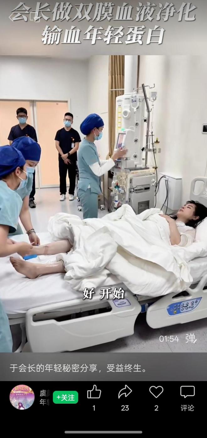 比如,一个发布时间为2024年、标题为“于会长做双膜血液净化、输血年轻蛋白”的视频显示,于文红躺在医疗推床上,对着镜头说:“现在去做那个血液变年轻(项目),不是输年轻人的血,而是18岁的男孩子血里面提炼出来的那个东西,那个会对身体特别好,而且皮肤也会看到明显的变化”。