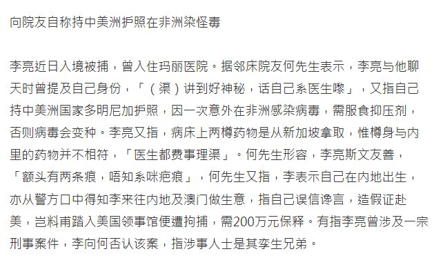 值得一提的是,港媒援引玛丽医院李亮邻床病友指出,李表示自己在内地出生,亦从警方口中得知李来往内地及澳门做生意,指自己误信谗言,造假证赴美,岂料踏入美国领事馆便遭拘捕,需200万元保释。有消息指李亮曾涉及一宗刑事案件,李向病友否认该案,指涉事人士是其双胞胎兄弟。