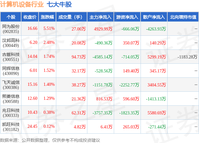 个股表现方面,计算机设备行业当日领涨股为同为股份(002835),该股当日报收16.66,上涨5.51%,成交量27.0万,主力资金净流入4929.99万元。汉邦高科(300449)以上涨2.48%紧随其后,该股当日成交量20.08万,主力资金净流出490.36万元。除此之外,古鳌科技(300551)、同辉信息(430090)、飞天诚信(300386)均进入当日牛股之列。具体个股列表见下表: