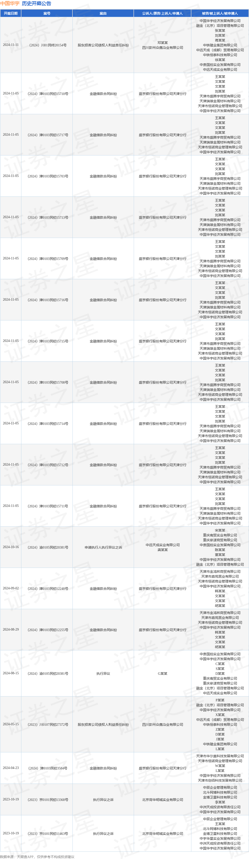 根据统计,近一年内以中国华宇经济发展有限公司为当事人的历史开庭公告有20则,其中案由为“金融借款合同纠纷”的公告以14则居首,其次为“执行异议之诉”有2则,“股东损害公司债权人利益责任纠纷”有2则。历史开庭公告如下: