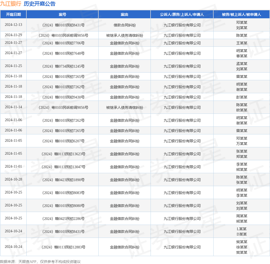 根据统计,近一年内以九江银行股份有限公司为当事人的历史开庭公告有1070则,其中案由为“金融借款合同纠纷”的公告以1041则居首,其次为“借款合同纠纷”有8则,“借款”有7则。历史开庭公告(前20条)如下:
