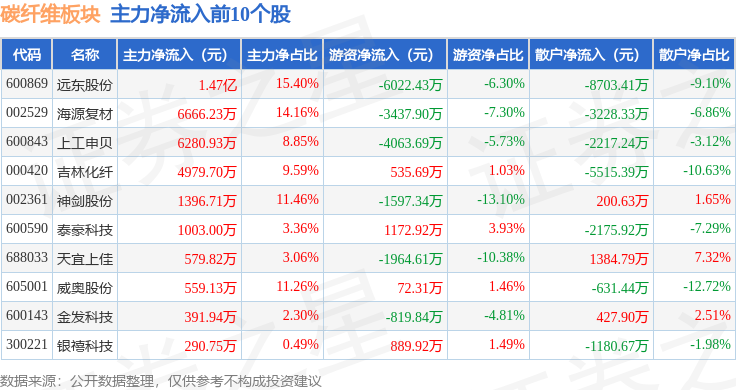 从资金流向上来看,当日碳纤维板块主力资金净流出1.27亿元,游资资金净流出2.1亿元,散户资金净流入3.37亿元。碳纤维板块个股资金流向见下表: