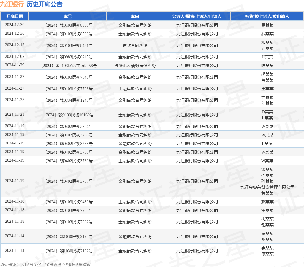 根据统计,近一年内以九江银行股份有限公司为当事人的历史开庭公告有1089则,其中案由为“金融借款合同纠纷”的公告以1060则居首,其次为“借款合同纠纷”有8则,“借款”有7则。历史开庭公告(前20条)如下: