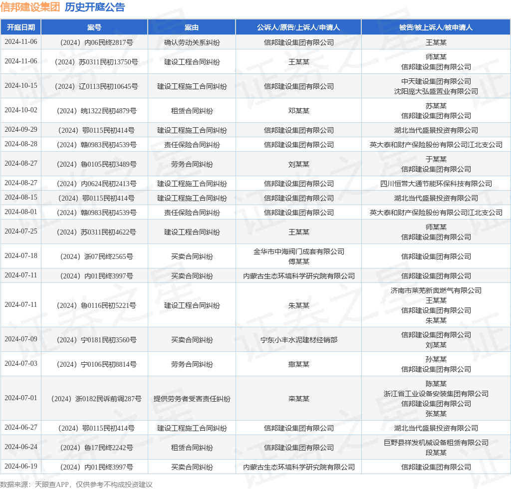 根据统计,近一年内以信邦建设集团有限公司为当事人的历史开庭公告有110则,其中案由为“建设工程施工合同纠纷”的公告以29则居首,其次为“买卖合同纠纷”有17则,“建设工程合同纠纷”有13则。历史开庭公告(前20条)如下: