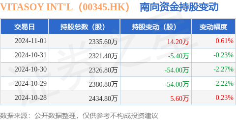 证券之星消息,11月1日南向资金增持14.2万股VITASOY INT'L(00345.HK)。近5个交易日中,获南向资金减持的有3天,累计净减持93.6万股。近20个交易日中,获南向资金增持的有9天,累计净增持76.4万股。截至目前,南向资金持有VITASOY INT'L(00345.HK)2335.6万股,占公司已发行普通股的2.16%。