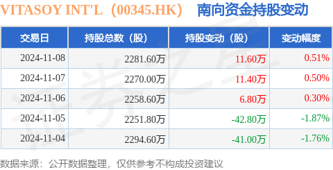 证券之星消息,11月8日南向资金增持11.6万股VITASOY INT'L(00345.HK)。近5个交易日中,获南向资金减持的有2天,累计净减持54.0万股。近20个交易日中,获南向资金减持的有12天,累计净减持429.4万股。截至目前,南向资金持有VITASOY INT'L(00345.HK)2281.6万股,占公司已发行普通股的2.11%。