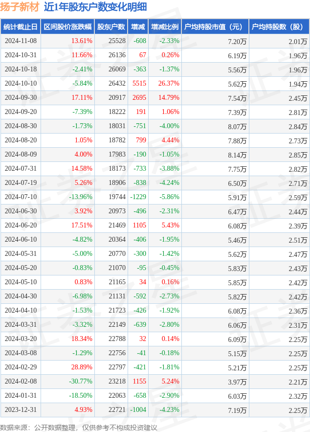 从股价来看,2024年10月31日至2024年11月8日,扬子新材区间涨幅为13.61%,在此期间股东户数减少608.0户,减幅为2.33%。