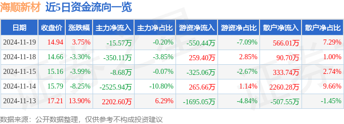 11月19日的资金流向数据方面,主力资金净流出15.57万元,占总成交额0.2%,游资资金净流出550.44万元,占总成交额7.09%,散户资金净流入566.01万元,占总成交额7.29%。