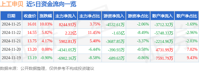 11月25日的资金流向数据方面,主力资金净流入8244.93万元,占总成交额3.75%,游资资金净流出4532.61万元,占总成交额2.06%,散户资金净流出3712.32万元,占总成交额1.69%。