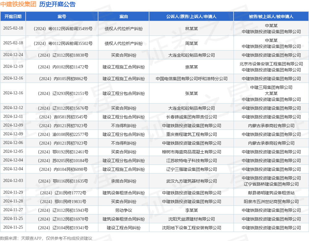 根据统计,近一年内以中建铁路投资建设集团有限公司为当事人的历史开庭公告有362则,其中案由为“买卖合同纠纷”的公告以152则居首,其次为“建设工程施工合同纠纷”有46则,“建设工程分包合同纠纷”有45则。历史开庭公告(前20条)如下: