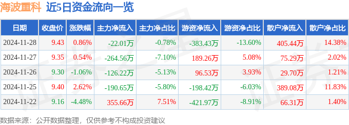 11月28日的资金流向数据方面,主力资金净流出22.01万元,占总成交额0.78%,游资资金净流出383.43万元,占总成交额13.6%,散户资金净流入405.44万元,占总成交额14.38%。