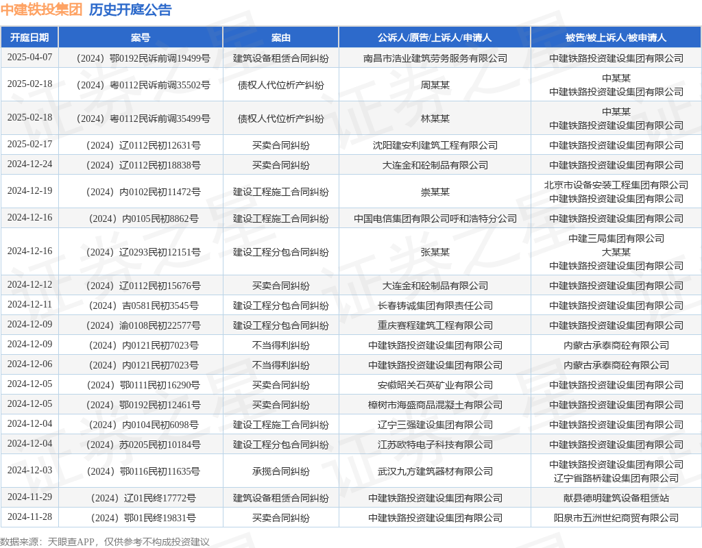 根据统计,近一年内以中建铁路投资建设集团有限公司为当事人的历史开庭公告有362则,其中案由为“买卖合同纠纷”的公告以152则居首,其次为“建设工程施工合同纠纷”有46则,“建设工程分包合同纠纷”有45则。历史开庭公告(前20条)如下: