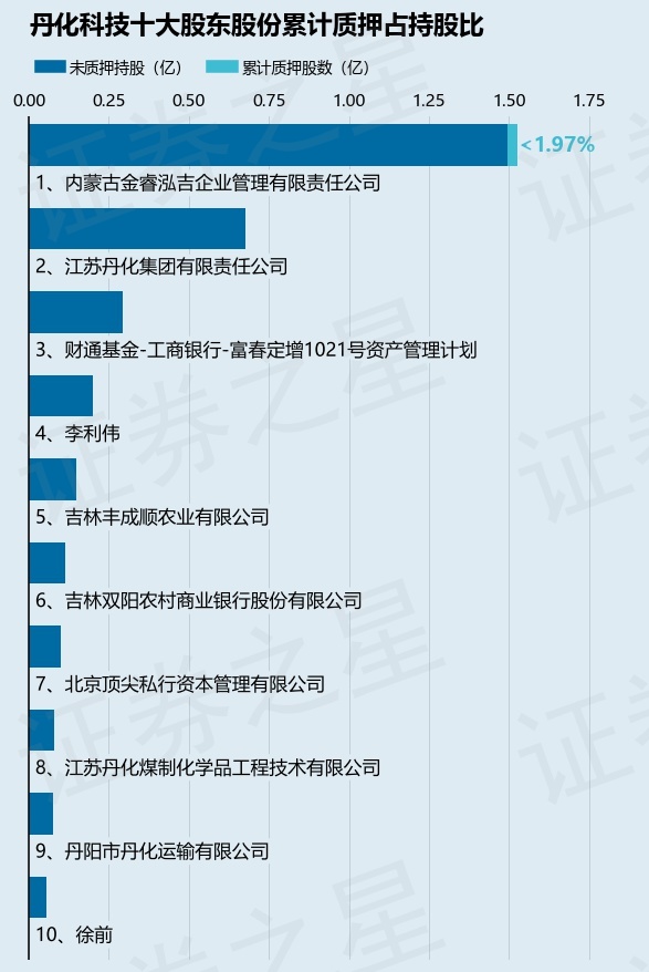 截止本公告日,股东内蒙古金睿泓吉企业管理有限责任公司已累计质押股份300.0万股,占其持股总数的1.97%。本次质押后丹化科技十大股东的累计质押股份占持股比例(占持股比例的计算以公司最新一期财务报表公布的十大股东的持股总数为基准)见下图: