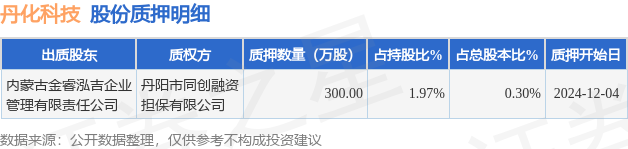 证券之星消息,丹化科技(600844)12月5日公开信息显示,股东内蒙古金睿泓吉企业管理有限责任公司向丹阳市同创融资担保有限公司合计质押300.0万股,占总股本0.3%。质押详情见下表: