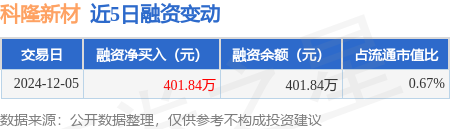 证券之星消息,12月5日,科隆新材(920098)融资买入432.8万元,融资偿还30.95万元,融资净买入401.84万元,融资余额401.84万元。