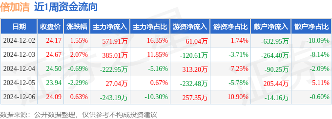 资金流向数据方面,本周倍加洁主力资金合计净流入517.81万元,游资资金合计净流入278.5万元,散户资金合计净流出796.32万元。本周资金流向一览见下表: