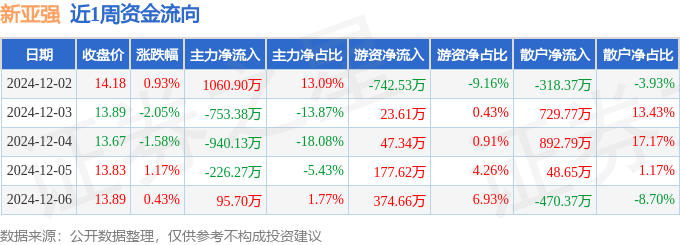 资金流向数据方面,本周新亚强主力资金合计净流出763.17万元,游资资金合计净流出119.3万元,散户资金合计净流入882.47万元。本周资金流向一览见下表: