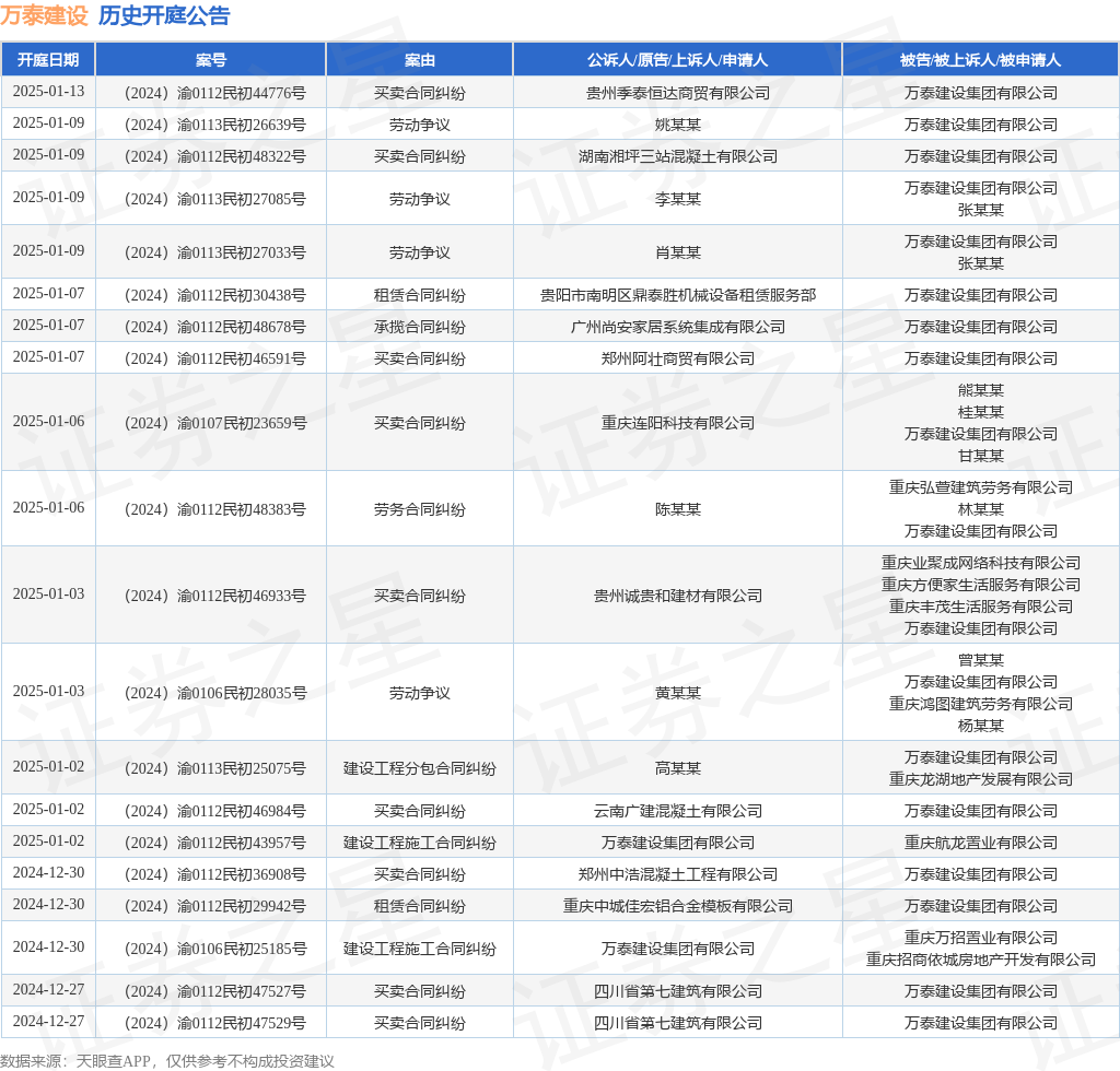 根据统计,近一年内以万泰建设集团有限公司为当事人的历史开庭公告有676则,其中案由为“买卖合同纠纷”的公告以132则居首,其次为“租赁合同纠纷”有127则,“劳动争议”有121则。历史开庭公告(前20条)如下: