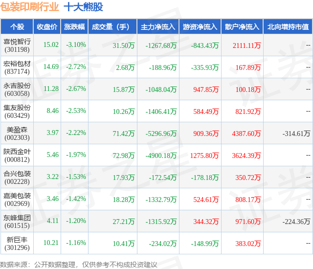 个股表现方面,包装印刷行业当日领跌股为喜悦智行(301198),该股当日报收15.02,下跌3.1%,成交量31.5万,主力资金净流出1267.68万元。宏裕包材(837174)以下跌2.72%紧随其后,该股当日成交量2.68万,主力资金净流出188.96万元。除此之外,永吉股份(603058)、集友股份(603429)、美盈森(002303)均进入当日熊股之列。具体个股列表见下表: