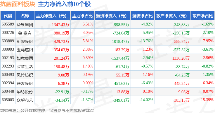 从资金流向上来看,当日抗菌面料板块主力资金净流出1.45亿元,游资资金净流出427.42万元,散户资金净流入1.49亿元。抗菌面料板块个股资金流向见下表: