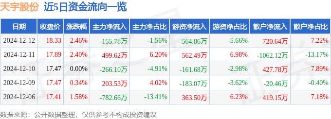 12月12日的资金流向数据方面,主力资金净流出155.78万元,占总成交额1.56%,游资资金净流出564.86万元,占总成交额5.66%,散户资金净流入720.64万元,占总成交额7.22%。