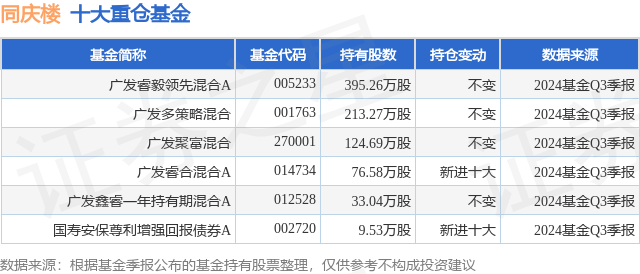 根据2024基金Q3季报公募基金重仓股数据,重仓该股的公募基金共6家,其中持有数量最多的公募基金为广发睿毅领先混合A。广发睿毅领先混合A目前规模为24.08亿元,最新净值2.4855(12月16日),较上一交易日下跌2.44%,近一年上涨5.72%。该公募基金现任基金经理为林英睿。林英睿在任的基金产品包括:广发多策略混合,管理时间为2016年12月16日至今,期间收益率为83.79%;广发聚富混合,管理时间为2018年11月5日至今,期间收益率为73.62%;广发价值领先混合A,管理时间为2020年5月7日至今,期间收益率为57.79%。